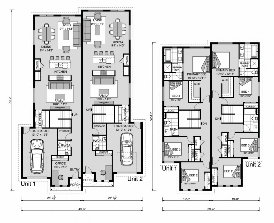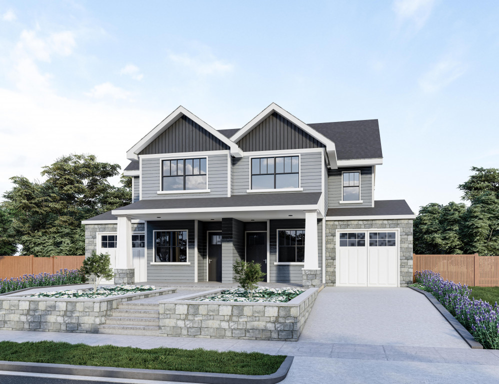 The Coronado is a two-story duplex cleverly configured with an offset mirrored layout with matching features, divided by a central wall with stunning curb appeal.