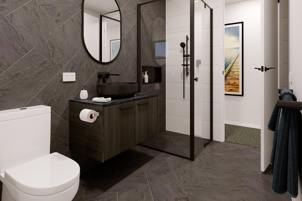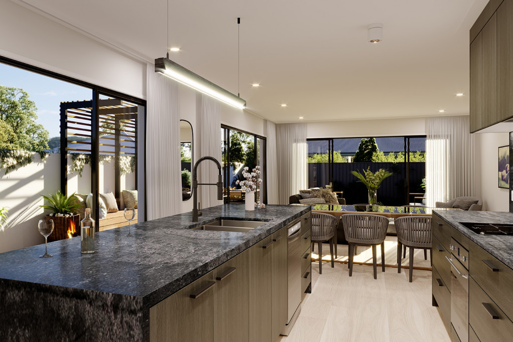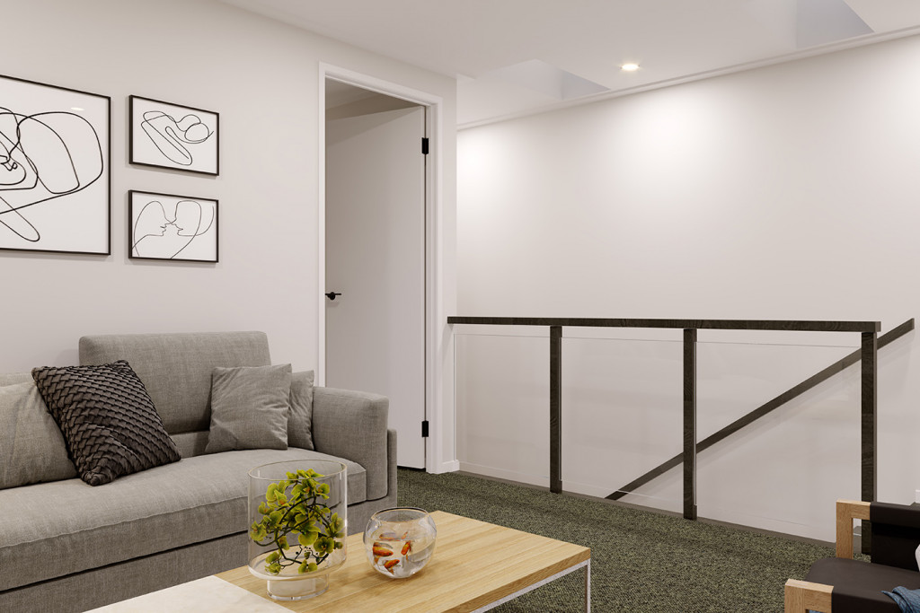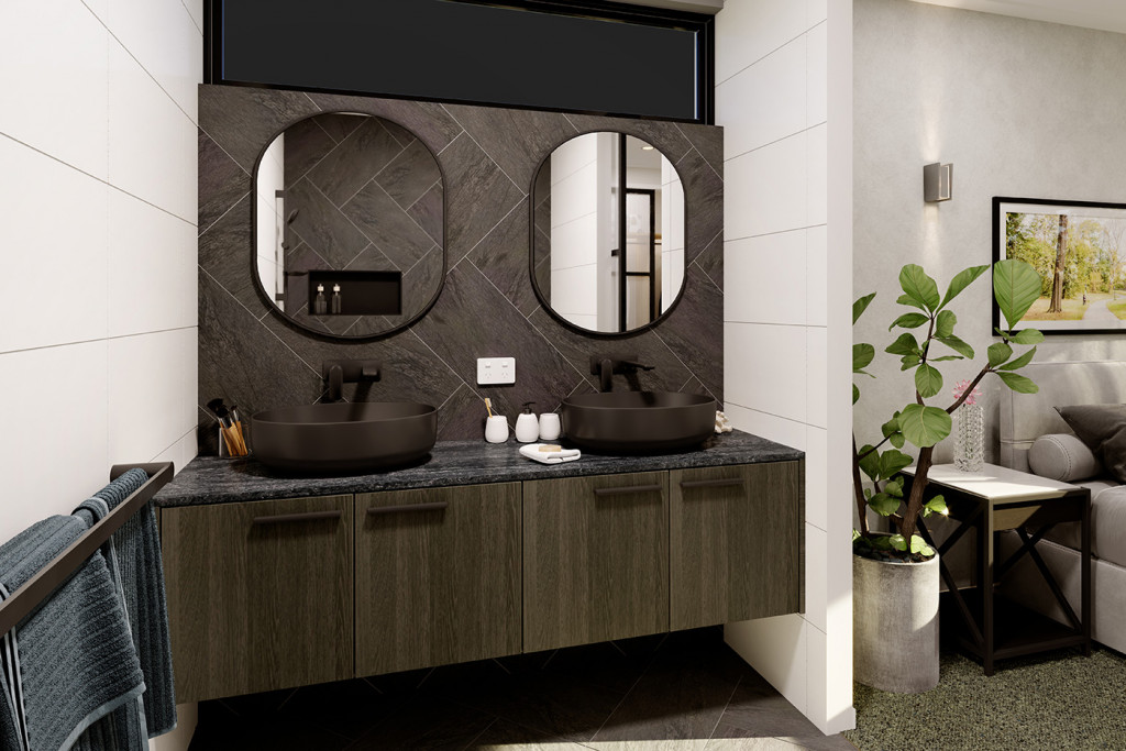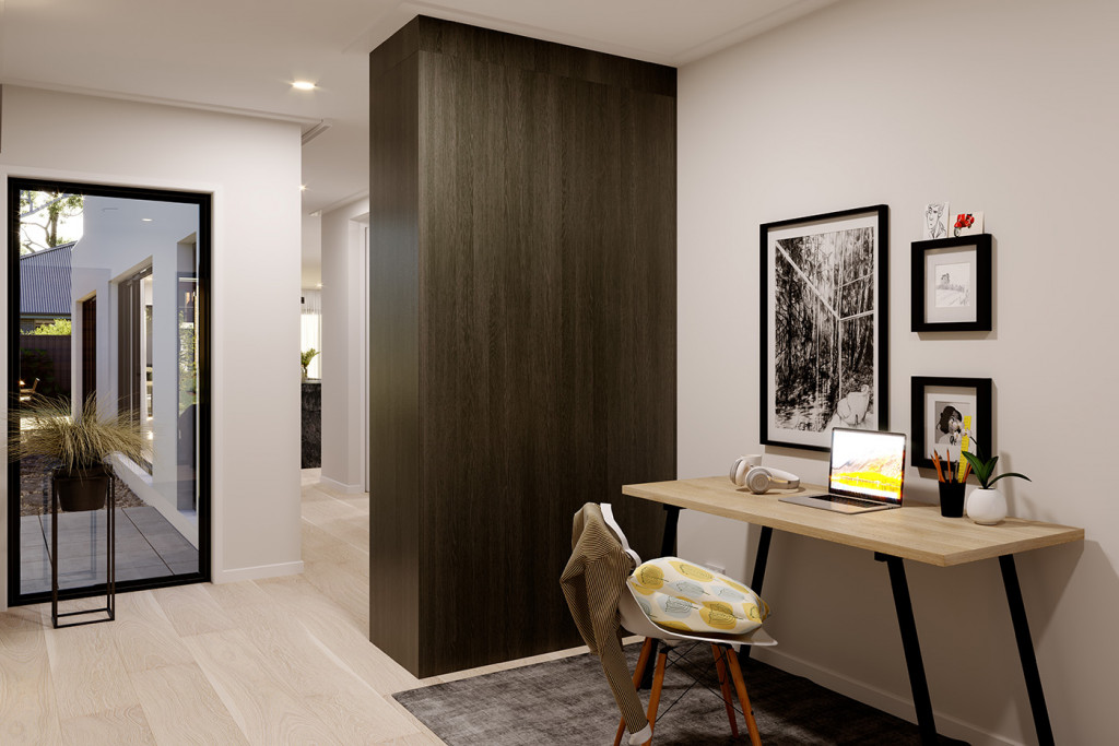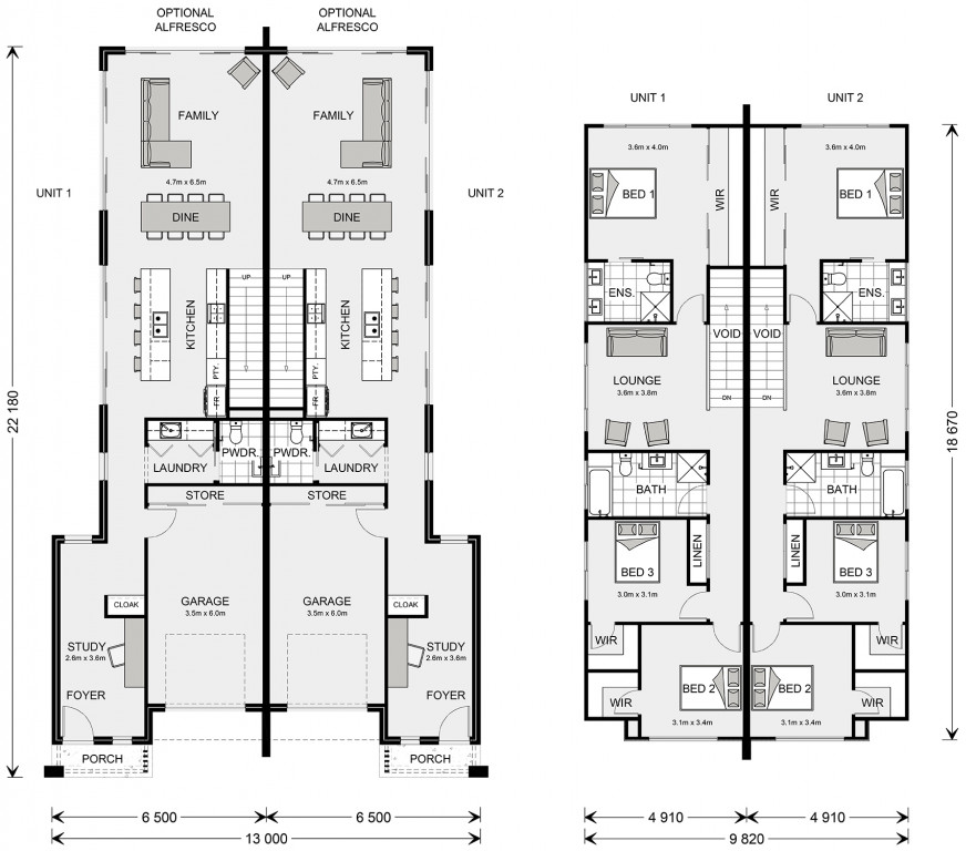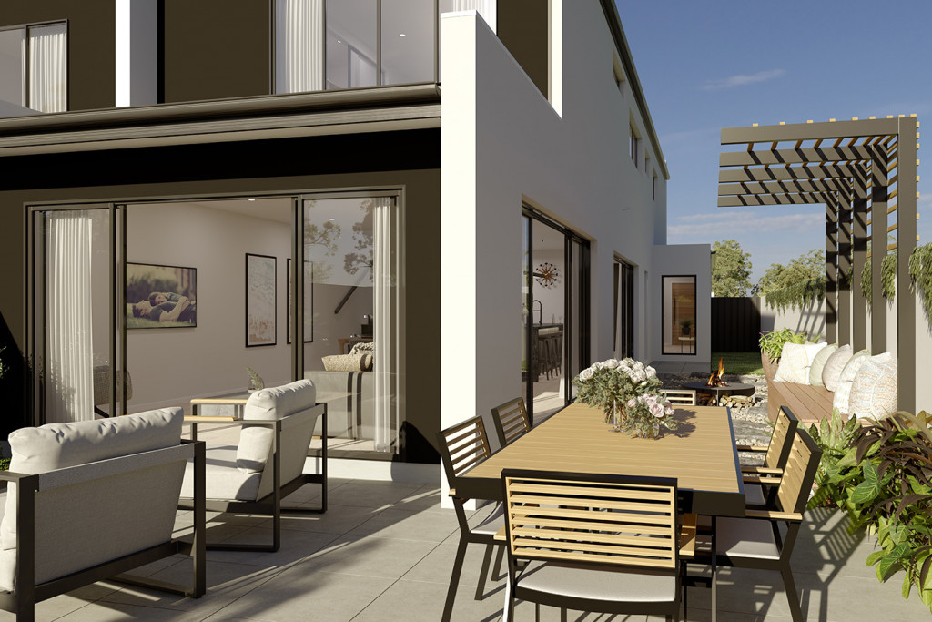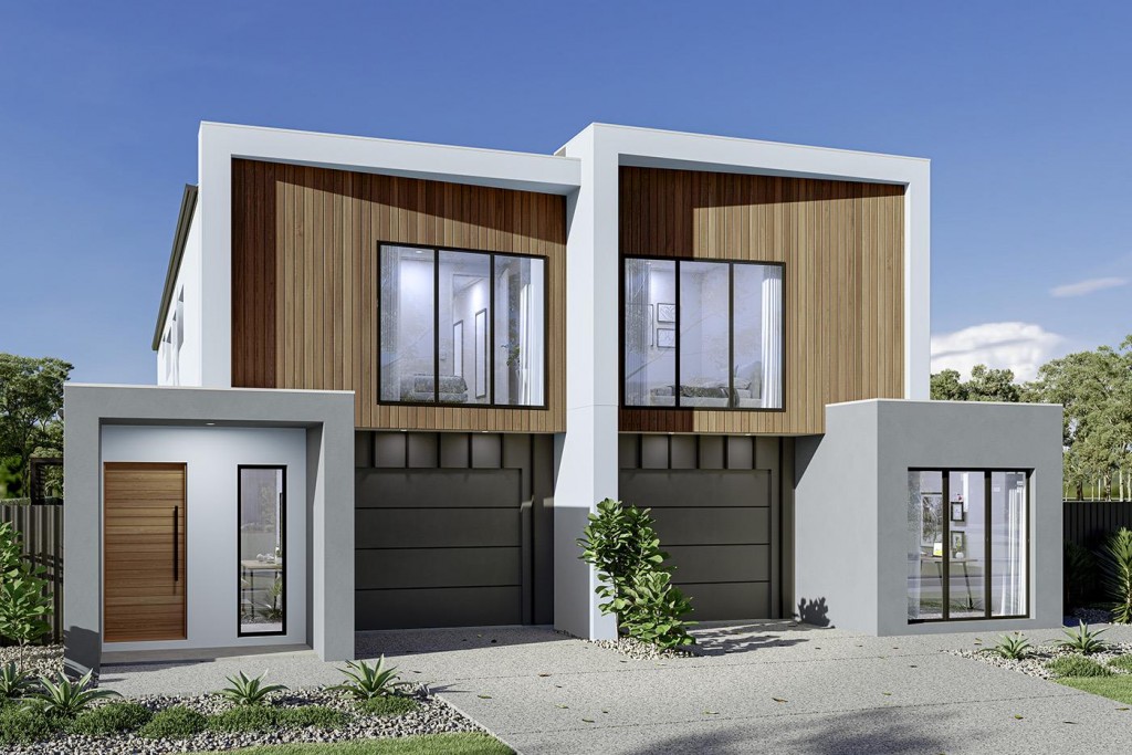 The Yarraville is a two-storey dual occupancy design with identical layouts, features, and impressive street appeal to both dwellings, mirrored and separated by a central dividing wall.